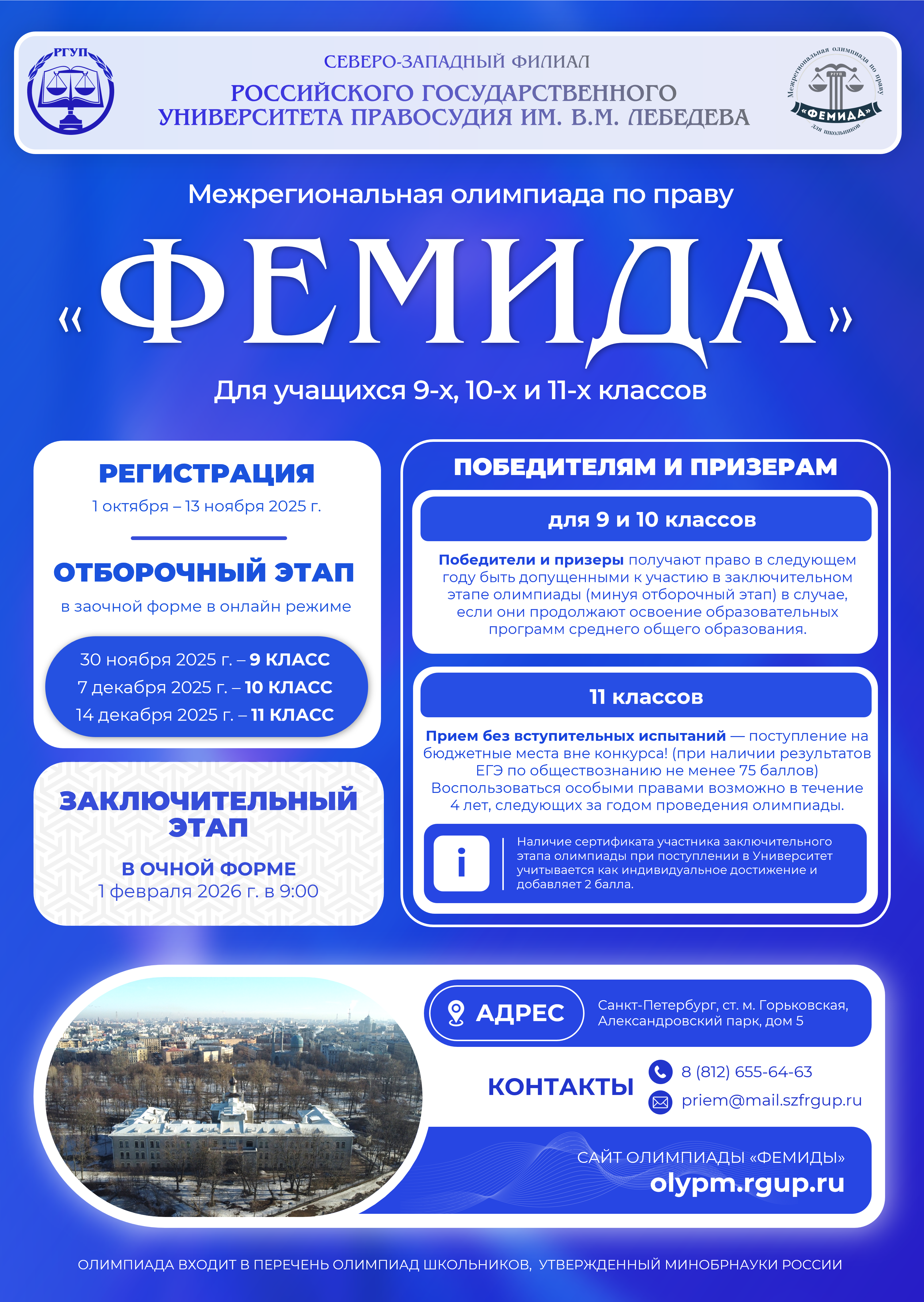 | Межрегиональная олимпиада по праву «Фемида» для учащихся 9-х, 10-х и 11-х классов. Межрегиональная олимпиада по праву «Фемида» для учащихся 9-х, 10-х и 11-х классов. Северо-Западный филиал Российского государственного университета правосудия Олимпиада входит в перечень олимпиад школьников,утверждаемых Министерством науки и высшего образования Российской Федерации, и является Олимпиадой II уровня, которая проводится в следующем порядке: - регистрацияучастников с 1 октября по 13 ноября 2025 года; -отборочный этаппроходитв заочной формев режиме онлайн посредством сети Интернет в период с 30 ноября по 14 декабря 2025 года (согласно графику). К участию - заключительный этаппроходит вочной форме, включает выполнение письменных заданий на выбранной участниками площадке. Дата проведения 1 февраля 2026 года. Победители и призерыОлимпиады,обучающиеся в 11 классах, получают возможность обучения на факультете подготовки специалистов для судебной системы (юридическом факультете) на местах, финансируемых за счет бюджетных ассигнований федерального бюджета (зачисление без вступительных испытаний при наличии результатов ЕГЭ по предмету «Обществознание» не ниже 75 баллов). Сертификат участника заключительного этапаучитывается в качестве индивидуального достижения и добавляет при поступлении 2 балла. Победители и призеры,обучающиеся в 9 и 10 классах, получают право в следующем году быть допущенными к участию в заключительном этапе Олимпиады, минуя отборочный этап. Подробная информация размещена сайтеhttps://olymp.rgup.ru
